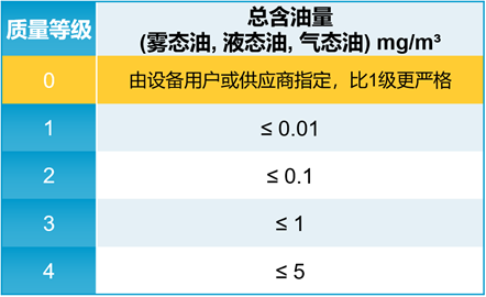 標(biāo)準(zhǔn)ISO 8573-1《壓縮空氣第一部分:污染物和純度等級》中明確定義,含油量分為5個等級,質(zhì)量等級的數(shù)字越低,代表壓縮空氣品質(zhì)越高。當(dāng)壓縮空氣中的總含油量,符合質(zhì)量等級0級時,就是通常所說的符合ISO 8573-1 CLASS 0的無油壓縮空氣。